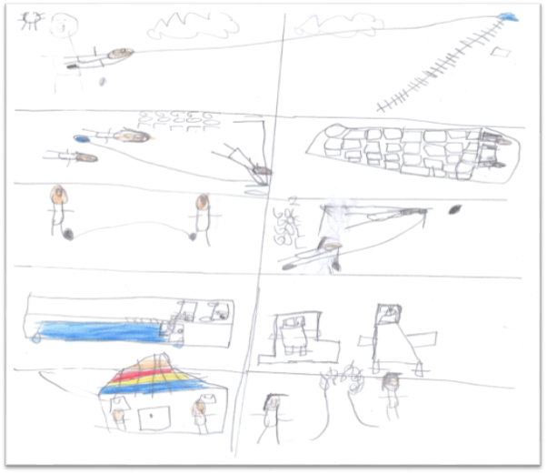 As crianças ao desenharem traçam o mundo pelo seu olhar, sendo esse ato uma das formas de materialização simbólica das culturas infantis, trazendo para suas construções os conflitos existentes nos espaços em que convivem. Para pensarmos esse ponto de criação artísticas das crianças, é preciso compreender que os aspectos inovadores e criativos da participação infantil na construção da realidade social, destacando as formas particulares das crianças criarem e participarem das culturas infantis, não se limitam a introjetar a sociedade e a cultura, mas contribuem ativamente para a produção e mudança cultural.