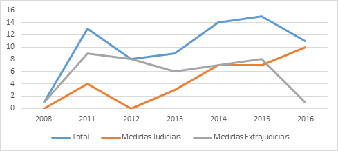 [2] Os dados coletados referentes às medidas extrajudiciais foram atualizados até maio de 2016 e os referentes às ações judiciais até julho de 2016.