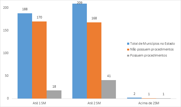 Portanto, apenas 40% dos municípios com procedimento encontram-se nas faixas mais altas de atendimento (acima de 33,169%), enquanto 49,1% dos municípios do estado encontram-se nessa faixa. A exceção parece se encontrar na faixa de atendimento mais alta, na qual se encontram apenas dois municípios no estado, sendo que em um deles há procedimento. Em todo caso, percebe-se uma relação, de modo geral, entre o baixo atendimento e a existência de medidas coletivas.