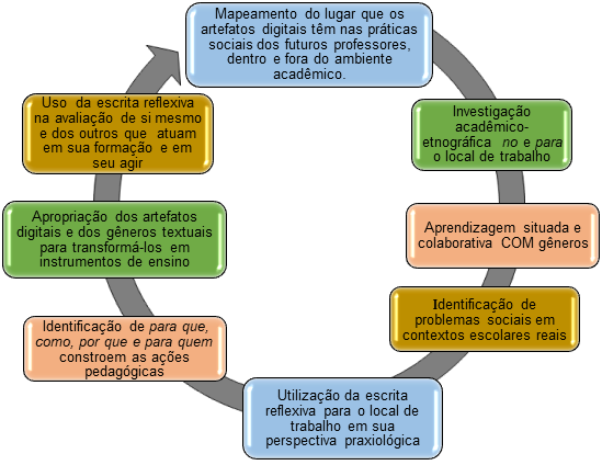 É preciso enfatizar que a principal peculiaridade do PROMULD reside na crença de que é necessário oportunizarmos aos futuros professores a construção do trabalho didático com os gêneros, inseparável dos contextos no e para o local de trabalho; especialmente, com os gêneros multimodais que circulam em suportes/ambientes digitais dentro e/ou fora do ambiente acadêmico e escolar. Ademais, acreditamos que propor aos futuros professores uma postura etnográfica nos contextos escolares e fazê-los refletir sobre, por meio da escrita com gêneros da esfera acadêmico profissional, lhes permitirá um maior agenciamento na aprendizagem, ao construírem conhecimentos a parti de si e com os outros. Nesse sentido, apresentamos na Figura 01 o percurso cíclico que acreditamos ter oportunizado a construção de letramentos didático-digitais dos futuros professores colaboradores da pesquisa, no intuito de incentivar outras práticas formadoras que compartilhem desse objetivo.