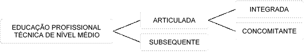 A lei que estabelece as diretrizes e bases da educação nacional (BRASIL, 1996) indica que a educação profissional técnica de nível médio pode ser articulada ou subsequente ao ensino médio, sendo que a primeira pode ser integrada ou concomitante (Ilustração 1). A diferença entre essas duas modalidades, conforme o texto da lei, está relacionada à forma de matrícula, que é única para cada aluno na modalidade integrada e distintas para a modalidade concomitante. A lei não apresenta outras possibilidades ou orientações relativas ao termo “integrada”.