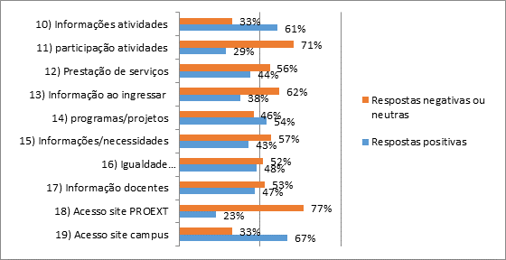 A Figura 2 mostra as perguntas de 10 a 19, que foram direcionadas a todos os participantes da pesquisa, objetivando identificar a percepção dos discentes com relação ao acesso/participação nas ações de extensão executadas pelo campus: