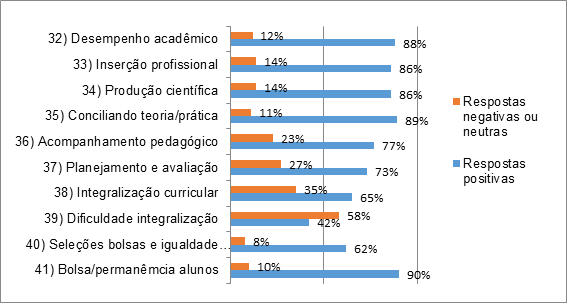 Quanto à percepção, relativa à indissociabilidade entre o ensino, a pesquisa e a extensão, nas perguntas de 21, 22, 23, 24 e 26, constatou-se que os discentes percebem essa diretriz, mas referendando as perguntas 21, 27 e 28, percebeu-se a interação maior com o ensino do que com a pesquisa, sendo constatado por um maior número de respostas neutras ou negativas nessas perguntas. Notou-se uma redução na percepção com relação às transformações e impactos que as ações de extensão promovem, entretanto, tais dados só podem ser comprovados quando realizarem pesquisas nas comunidades, após estas ações.