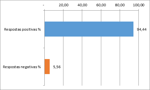 Nas análises quanto ao acesso/participação, ficou evidenciado que dos 36 docentes que responderam a pesquisa, dois não conheciam a extensão praticada pelo campus. Apresenta-se, na figura 7, a percepção dos docentes que participaram da pesquisa, correspondendo a 94% de forma positiva, como conheciam ou praticavam atividades de extensão: