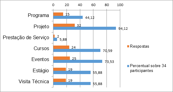 Dentre as atividades de extensão, as mais conhecidas pelos docentes foram os projetos, cursos e eventos. Os docentes podem completar sua carga horária com cursos livre de extensão ou de formação inicial e continuada, com eventos envolvendo os discentes e a comunidade, entretanto, o mais conhecido por esses docentes, está o projeto de extensão.
