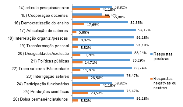 Nas perguntas 14, 15 e 24, o nível de percepção está em “não sabe” a “raramente”. Elas remetem à interdisciplinaridade, ou seja, os docentes estão com dificuldades para articular as disciplinas, metodologias e a cooperação entre eles para executar as atividades extensionistas. Da forma como são apresentadas as ações de extensão, verifica-se que muitas têm somente um docente como orientador, situação justificada pelas porcentagens de respostas neutras e negativas nas perguntas 14, 15 e 24.