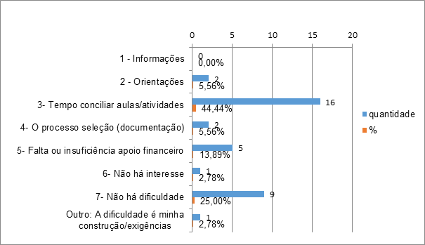 Quanto à falta de apoio financeiro e a seleção para participar das ações de extensão, entende-se que, dentre as atividades mais conhecidas, estão os projetos, que podem ser desenvolvidos mediante bolsas de extensão. Para esse tipo de seleção, existem normas próprias para discentes e docentes; a seleção pode ser uma dificuldade para aqueles que não se enquadram nas regras, ficando outra opção, os projetos com estudantes voluntários, que são executados sem a viabilização de bolsas. Existem outras possibilidades para serem trabalhadas como ações de extensão, resta saber o porquê de serem atrativas.