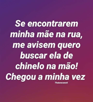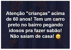 O card “Se encontrarem minha mãe na rua, me avisem quero buscar ela de chinelo na mão” (Figura 63) é bastante emblemático da posição tutelar e punitivista, apelando para a violência. Da mesma forma, a Figura 7, “Atenção ‘crianças’ acima de 60 anos! Tem um carro preto no bairro pegando idosos pra fazer sabão! Não saiam de casa!”, reforça a interpelação pelo medo e ameaça.