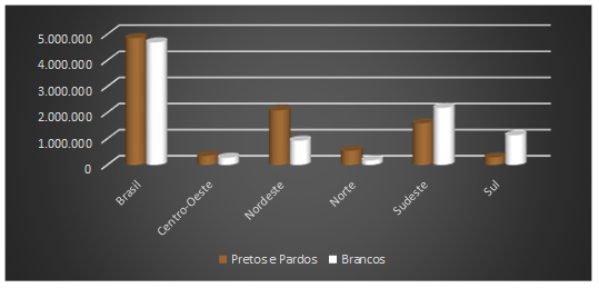 Como podemos perceber com o Gráfico 1, no Censo 2010, a população classificada pelo IBGE “com deficiência auditiva” foi o total de 9.717.318, dentre as quais, cerca de 4.856.506 são negros(as), (preto(as) e pardos(as)). Dos quase 10 milhões de sujeitos “com deficiência auditiva”, espalhados pelo país, cerca de 3,8 milhões estão na região Sudeste, 3 milhões na região Nordeste, quase 1 milhão e meio na região Sul, 737 mil no Norte e 633 mil no Centro-Oeste do Brasil. Outro dado importante é que nas regiões Sudeste e Sul, a maior parte dessa população é branca, ao passo que nas demais regiões o maior quantitativo é de pessoas negras, tanto para homens quanto para mulheres. O censo destaca que a maior concentração da população “deficiente auditiva” identificada como negra, quase 70%, está numa das regiões do país, a Nordeste, mais empobrecida pelo saqueio e exploração históricos. Esse é um caso clássico de “negligência sociolinguística”, de “geo-ontoepistemicídio” e de “elo geográfico de preconceito e descaso” (SILVA; LIMA; REZENDE, no prelo; REZENDE, no prelo).