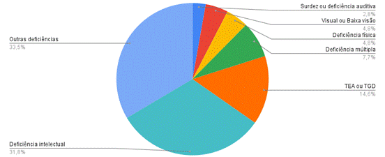 Há a predominância da deficiência intelectual (DI), de estudantes com transtorno do espectro autista (TEA), bem como uma quantidade considerável de estudantes que se enquadram em outras deficiências. Isso porque, além dos estudantes considerados público-alvo da educação especial, nas SRMs pesquisadas por Faria, Vieira e Martins (2021) também são atendidos alunos que não possuem laudo médico, estudantes em processo de avaliação e estudantes que não se enquadram nas categorias de atendimento. Podemos perceber que, no momento da pesquisa, em um total de 887 alunos atendidos nas SRMs, 236 não faziam parte do público-alvo da Educação Especial, fator que nos chamou a atenção. Ao avançarmos na pesquisa foi possível verificar que esta é uma realidade vivenciada não só por estes professores das SRMs vinculadas à Secretaria Regional de Ensino do Estado de Minas Gerais, mas também por professores de outras secretarias e redes de ensino. Os estudantes que não se enquadram no AEE da SRM são aqueles com transtornos funcionais específicos, que englobam desde discalculia, disgrafia, Transtorno do Déficit de Atenção, entre outros. Estes estudantes não necessitam de apoio para avançar no seu processo de aprendizagem? Seria a SRM também uma possibilidade para esses estudantes?