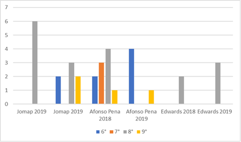No ano seguinte, em 2019, no 6° ano, 4 planos foram identificados. Um deles associava na metodologia a classificação dos fusos horários com as faixas climáticas; os outros 3 planos discorriam sobre a relação do clima e da vegetação no conteúdo referente à atmosfera; e 2 deles diferenciavam clima e tempo. No 7° e 8° anos, não foi identificado nenhum plano de Climatologia, porém, no 9° ano, um plano foi encontrado, relacionando o clima e a vegetação com o continente africano e seus biomas.