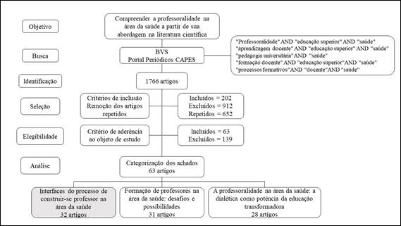 No processo de busca e seleção dos estudos, estabelecemos os seguintes critérios de inclusão: trabalhos publicados no formato de artigos científicos (artigos originais, revisões sistematizadas, relatos de experiências, ensaios teóricos, reflexões), nos idiomas inglês, português e espanhol, disponíveis online em texto completo em acesso livre, cujos objetivos apresentassem aderência ao objeto de estudo (professoralidade na área da saúde). Além disso, foram excluídos os estudos repetidos, mantendo-se apenas um deles.