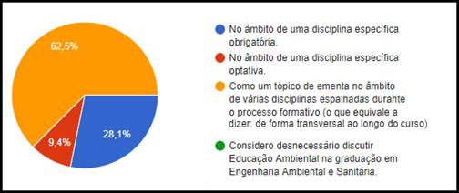 No Gráfico 3, estão representados os dados relativos à questão sobre como a EA deveria ser discutida no processo formativo. Os resultados demonstram que 62,5% dos respondentes acreditam que a EA deveria ser tratada de forma transversal ao longo do curso. Brasil (1999) reforça a importância de conectar disciplinas em torno do tema EA. Na mesma direção, Silva e Heatinger (2012), destacam que a transversalidade exerce substancial importância na construção de conhecimentos, teóricos e práticos, sobre a temática ambiental. Os 28,1% de respondentes que consideram a necessidade de uma disciplina obrigatória sobre EA também merecem destaque. O que fica evidente nessa soma – 62,5% + 28,1% - é que 90,6% dos estudantes consideram necessária a discussão, transversal ou pontual, de conteúdos sistematizados e aprofundados sobre a temática.