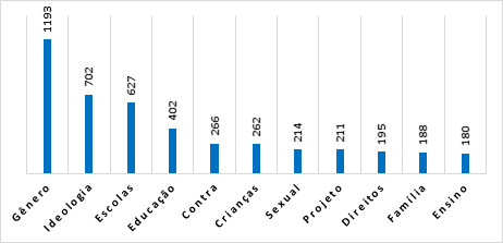 Como se observa, a palavra gênero é a mais citada, indicando a disputa por esse termo, que ora aparece no discurso de sujeitos políticos e pesquisadores/as que defendem o debate de gênero nas escolas, em vista da promoção dos direitos humanos, da construção de uma cultura igualitária e do respeito às diversidades; ora aparece no discurso de políticos e de integrantes de um governo de extrema direita, em que o gênero é associado a uma ideologia que precisa ser combatida por ameaçar os valores sobre determinada ordem sexual e modelo tradicional de família.