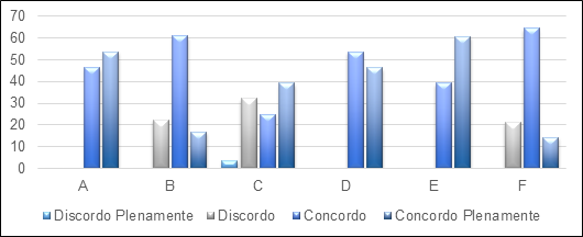 Em relação ao desvio padrão, chama-se a atenção para as assertivas A e D, visto que ambas apresentam o mesmo desvio padrão, mas diferem no valor da média. Neste desenho, a partir do Gráfico 1, percebe-se que os sujeitos pontuam, em uma mesma frequência, apenas graus de concordância; logo, como a assertiva A caracteriza-se com um maior número de apontamentos no grau 4 (Concordo Totalmente), essa acaba por apresentar uma maior média. Estranhamente parecido, as assertivas B e F contemplam a mesma média e o mesmo desvio padrão, todavia, a partir do Gráfico 1, percebe que há discrepância no número de vezes que um grau foi apontado; logo, acredita-se que a existência de uma mesma média ocorra pelo número de apontamentos no mesmo grau de concordância, considerando que a assertiva B, apesar de ter maior número de apontamentos na discordância, logrou mais apontamento no grau 4.