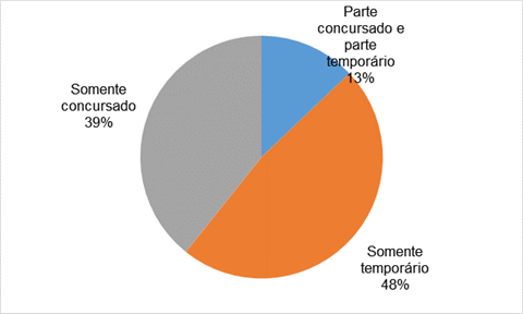 Como é possível observar no Gráfico 5, dos 163 professores que responderam ao questionário, 64 (39%) declararam serem concursados. É impressionante o número de professores somente com contrato temporário, que chega a 78 (48%), e daqueles que, embora estejam concursados, possuem um contrato temporário para complementação (21,13%). Nota-se, a partir dos dados, que 61% dos professores respondentes, ou seja, praticamente dois terços dos professores, possuem pelo menos um contrato temporário.