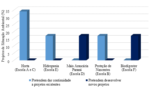 Das instituições de ensino que já desenvolvem projetos voltados à Educação Ambiental, todas pretendem implementar novos e/ou dar continuidade aos projetos iniciados (Fig. 8). Quatro escolas (A, B, C e E) pretendem dar continuidade em projetos já iniciados ou concluídos que foram bem-sucedidos (horta – escolas A e C, hidroponia – escola E, e proteção de nascente – escola B) e outras duas escolas (D e F) pretendem iniciar projetos novos que ainda não foram desenvolvidos em suas instalações, tais como Projeto Mais Araucária Paraná e Biodigestor, respectivamente.