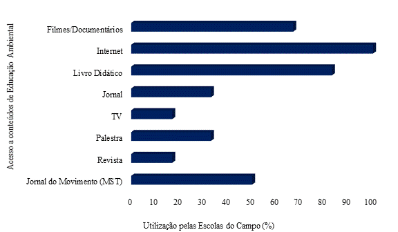 Ao questionar as instituições de ensino a respeito de quais meios a escola utiliza para acessar conteúdo de Educação Ambiental, os diretores entrevistados informaram que compreendem filmes/documentários, internet, livros didáticos, jornais, revistas, TV, palestras e jornal do MST (Fig. 12).