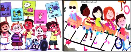 As imagens que apresentam a deficiência surgem em vários momentos ao longo do texto didático e sob formas que representam crianças: cadeirante, com síndrome de Down, cegas, surdas e com deficiência física. As deficiências sensoriais, como a surdez e a cegueira, estão presentes, inclusive, com imagens da língua de sinais (Libras) e com o alfabeto em Braile. De maneira geral, as imagens projetam a inclusão escolar pelo convívio e pela acessibilidade ao proporem atividades pedagógicas em diversos componentes curriculares.