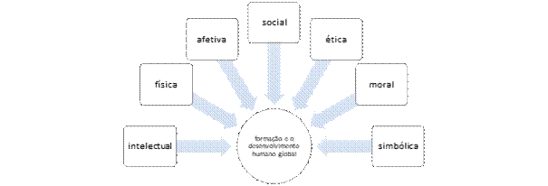 Considerando-se as concepções de currículo como pista, caminho ou mapa (cfe. Sacristán,2013; Pinar, 2011) sobressai-se a intencionalidade da construção, do projeto elaborado a partir de pressupostos, de bases que orientem a sua elaboração e efetivação como os PCNs (Parâmetros Curriculares Nacionais) e as DCNs (Diretrizes Curriculares Nacionais), utilizadas nas últimas décadas, e a Base Nacional Comum Curricular (BNCC) homologada em dezembro de 2018[1], objeto da reflexão presente. Em sua introdução, a BNCC se propõe como base, ponto de partida para PCNs e DCNs e articula discursivamente o reconhecimento de valores relacionados a uma “formação e o desenvolvimento humano global, em suas dimensões intelectual, física, afetiva, social, ética, moral e simbólica. ” (BRASIL, 2018, p. 16), sintetizada na figura a seguir: