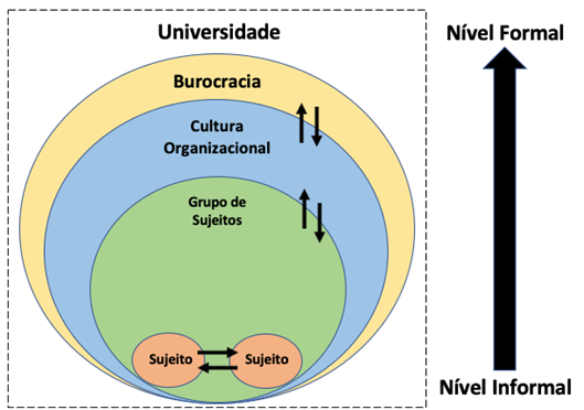 Em nossa compreensão, o aparato cultural compreende normas, valores, símbolos e outros que permeiam as relações intra-organizacionais. Em instituições que adotam uma estrutura mais flexível, pode-se recorrer mais à cultura do que ao estatuto racional como forma de conduzir e delimitar a agência visando ao alcance dos objetivos, à eficiência, à legitimação do exercício do poder etc. As universidades federais e estaduais, contudo, cimentam-se na complexa dinâmica de inter-relação entre o cultural e o burocrático. Ambos podem contar com certa harmonia, ou desestabilizar-se, o que pode causar movimentação e, assim sendo, levar a transformações – ainda que estas sejam, por via de regra, mais difíceis dentro da lógica dessas universidades recalcitrantes à inovação. Por fim, os sujeitos são, como já discutimos, o átomo das instituições. Eles compõem grupos que se articulam de variadas formas – entre pares, entre departamentos, entre colegas e outros. Os indivíduos é que interpretam os micro e macro elementos para, a partir disso, atribuir sentido subjetivo à sua ação socialmente orientada. Ação esta que assume formatos com invólucro estrutural, mas que, para nós, não deixam de significar, em última instância, sujeitos atuando reciprocamente.