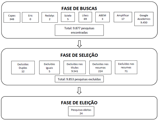 Foram realizadas três fases distintas para a seleção de documentos: (1) a fase de busca, na qual foram coletados os estudos nas bases indexadas, (2) a fase de seleção, cujo objetivo foi filtrar os achados, considerando os critérios de inclusão e duplicidades apuradas e (3) a fase de eleição, em que foram definidos os estudos para a análise. As buscas dos trabalhos foram feitas em par, com dois pesquisadores, nas mesmas bases de dados e utilizando os mesmos descritores, e depois juntadas e cruzadas para fazer a seleção final. Após a busca e seleção dos trabalhos, foram selecionados 24 estudos para essa revisão de escopo: