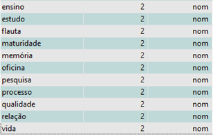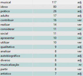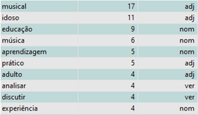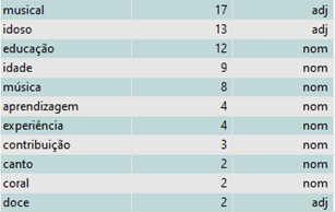 A análise quantitativa das palavras dos títulos, resumos, objetivos e referências dos estudos revelou que estas pesquisas visam, em sua maioria, o contexto social, tendo palavras como educação, idosos, música forte representatividade, envolvendo contextos como o canto coral, as aulas de música e locais como centro de vivências e casas de acolhimento de pessoas idosas. Observamos que estes estudos buscaram soluções e compreensões a respeito de aprendizados musicais que vêm acontecendo com idosos no contexto social, real e atual, com ênfase no fazer musical coletivo, envolvendo qualidade de vida e inclusão.