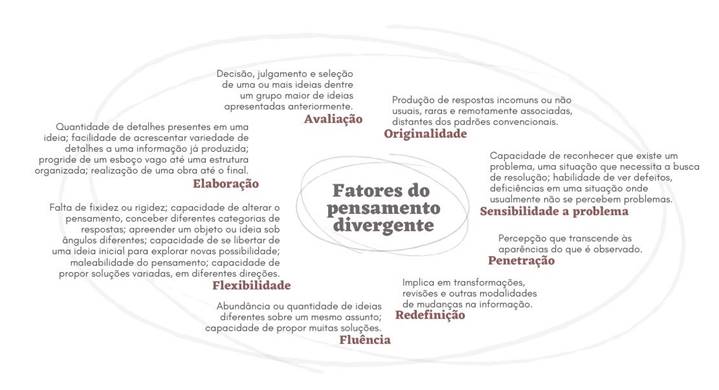 Discussões apresentadas por diversos autores (ALENCAR 1974, 1986, 2009; NOVAES 1980; LUBART 2007; GRASSI 2010), evidenciam algumas características do pensamento criativo, vinculadas aos mecanismos cognitivos denominados de pensamentos divergente e convergente. Através de estudos sobre as habilidades intelectuais e outros traços marcantes dos indivíduos criativos, Guilford desenvolveu uma teoria da inteligência, distinguindo diferentes tipos de operações intelectuais. “Uma dessas operações, a que ele chamou de produção divergente ou pensamento divergente, seria fundamental para a criatividade” (ALENCAR 1974, p. 61), pois se caracteriza como “processo que permite pesquisar de maneira pluridimensional as numerosas ideias ou respostas a partir de um simples ponto de partida” (LUBART 2007, p. 26).