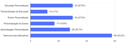 No que diz respeito ao Conhecimento sobre educação personalizada, o Gráfico 2, apresenta os resultados sobre quais termos relacionados à educação personalizada (educação personalizada; personalização da educação; ensino personalizado; personalização do ensino; aprendizagem personalizada) os participantes conheciam. É importante ressaltar que eles marcaram todos os termos que conheciam, ou seja, era possível responder mais de uma alternativa.