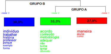 O filograma (Figura 2) pode ser interpretado através da leitura dos grupos A e B formados. Como exposto, o corpus foi divido em 3 classes (discursos), originários de dois subcorpora (grupo A e grupo B), o grupo A origina as classes 1 e 2, o grupo B, origina a classe 3. Esses subcorpora representam a correlação que existe entre os discursos criados a partir do corpus.