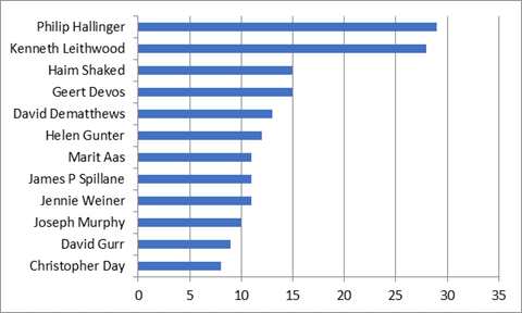 Conforme informado, anteriormente, utilizamos a Base do Web of Science (WoS). Destaca-se que não utilizamos filtros. Esta decisão mostrou que o primeiro artigo sobre o tema foi publicado em 1982. Portanto, foi considerado o período entre 1982-2022, resultando na análise de 538 artigos. Também, incluímos um filtro que incluiu na pesquisa apenas autores com, pelo menos, cinco artigos sobre o tema. Assim, cumpriu-se o propósito de compreender o próprio desenvolvimento da pesquisa sobre liderança escolar ao longo do tempo, especialmente a partir de estudiosos que se dedicaram ao estudo desta temática por, pelo menos, uma década. Provavelmente, por este motivo, não encontramos publicações ao longo dos anos de 1990, 1994, 1995, 1996, 2001, 2006.