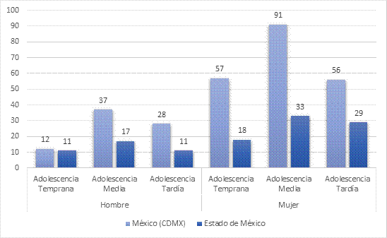 La muestra estuvo conformada por 400 adolescentes de 13 a 20 años. En la figura 1 se presenta la distribución de los participantes en función del estado de residencia, el sexo y el grupo de edad o etapa de la adolescencia, y se puede observar que hubo una mayor proporción de mujeres de la Ciudad de México.
