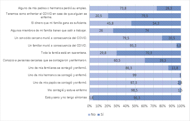 Con respecto a las variables contextuales asociadas con el COVID-19, en la figura 2 se puede observar que la mayoría de los participantes se percibían sanos y sin síntomas al momento de la evaluación. A pesar de que el 70% de la muestra reportó que toda su familia estaba en cuarentena, también se identificó que la mayoría tenía algún miembro de la familia que debía salir a trabajar, aún durante el confinamiento.