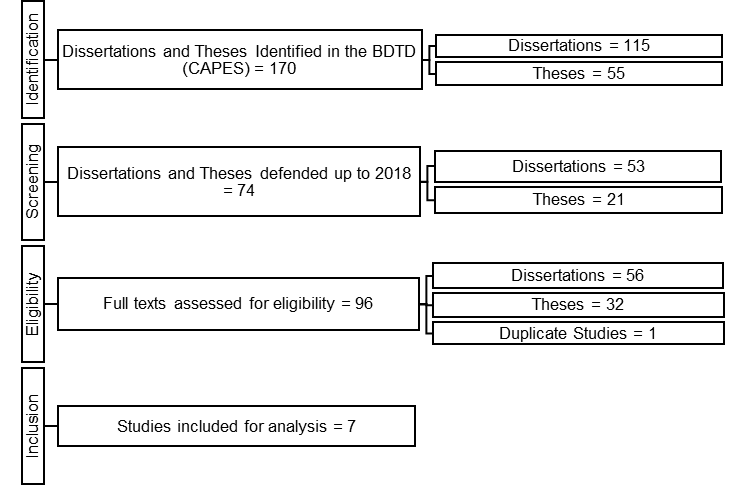 This research was conducted in October 2023. Initially, we found 170 results — 115 dissertations and 55 theses. After refining the search to include only recent works from the last five years (2018–2023), we found 96 results: 62 dissertations and 34 theses. Finally, after analyzing the abstracts and some excerpts from the dissertations and theses, only seven studies remained, which will be detailed below.