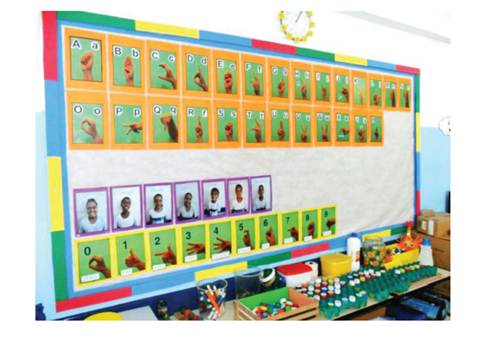 Outro elemento visual que comumente faz parte do cenário pedagógico é o alfabeto manual (podemos vislumbrar na figura 5). Na figura mencionada, tal código de representação aparece como um material de apoio e, ao mesmo tempo, compondo o deaf space[6]. O uso do alfabeto manual como um apoio para as práticas de ensino da língua portuguesa ainda é recorrente e, como vimos anteriormente, historicamente foi se consolidando como uma “estratégia”, “recurso”, “apoio”, para a compreensão do sistema de escrita e composição de palavras em diferentes países. Podemos vislumbrar esse uso na pesquisa feita por Fernandes e Romeiro (2016, p. 182), que adotou o alfabeto manual num contexto de sala de aula de ouvintes e que obteve resultados significativos no aprendizado do alfabeto da língua portuguesa. A professora entrevistada pelas pesquisadoras afirmou “a datilologia auxiliou como recurso metodológico no ensino sendo uma ótima metodologia, continuarei a utilizar nos demais anos, é simples, fácil, e está na mão do professor a qualquer instante. Estimulou as crianças como uma atividade lúdica e prazerosa”. Diante da experiência compartilhada, destacamos que o uso do alfabeto manual não se restringe ao público surdo e seu uso alargado possibilita avanços no processo de alfabetização e letramento também em contextos de ouvintes.