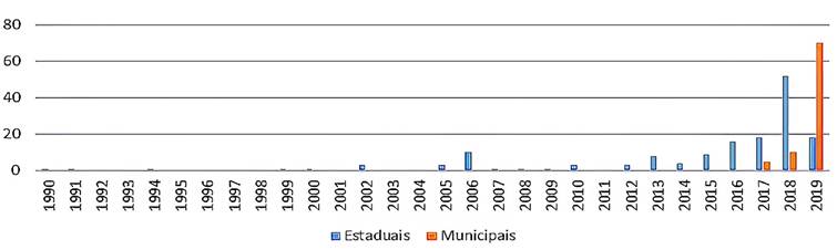 Os seguintes elementos (Tabela 1 e gráfico 1) permitem uma visão abrangente do processo de militarização nacional e demonstram que esse processo também é adotado em escolas municipais.