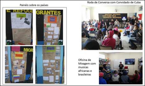 Além das atividades conduzidas pelos(as) multiplicadores(as), também tivemos rodas de conversa, cinedebate e participação de convidados(as) na escola. Ao longo do ano cada turma ficou responsável por um país (Angola, Cuba, Venezuela, Haiti etc.) e, em agosto, houve a atividade de culminância do projeto com as exposições dos trabalhos, como danças de origem angolana, pratos típicos de Angola, painéis/pôsteres sobre a história de alguns países, suas línguas/dialetos, as bandeiras, encerrando com uma conversa com um convidado de Cuba e uma oficina de mixagem com músicas brasileiras e africanas contemporâneas.