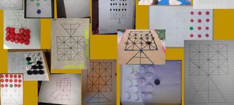 A partir dessa base, a professora-pesquisadora propunha a vivência de jogos e brincadeiras corporais, tais como: Terra-mar, Fogo na Montanha, Simamaka, Pegue o Bastão, Mamba, Mbumbe, Teca-Teca (de origem africana), cabo de guerra, arranque a mandioca e peteca (no caso da peteca, os(as) estudantes primeiramente eram convidados(as) a confeccionar as petecas). Na sequência centrava-se na construção e prática de jogos de mesa/tabuleiro, como a Mancala (especificamente a Oware), o jogo do Moinho ou Labirinto e o Jogo da Onça. Ao final da unidade didática de Jogos e Brincadeiras, a professora propôs um trabalho final em que os alunos deveriam pesquisar e produzir o que nomeou de Glossário Ilustrado de Jogos e Brincadeiras Afro e Indígenas, o qual era exposto no evento da escola referente ao mês da Consciência Negra. No ano de 2020, a partir de muitas adaptações, a professora seguiu trabalhando com essa temática com o 6° ano, de forma remota, onde ela construía o mesmo diálogo e problematizações, mas na parte da construção e prática cada estudante era convidado(a) a realizar as atividades em casa com suas famílias.