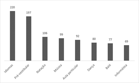 No contexto brasileiro, os poucos estudos existentes têm indicado a relevância da participação de crianças e jovens em cursos de idiomas, cursos preparatórios para o vestibular e em aulas particulares de determinadas disciplinas. Ainda que geralmente baseados em pequenas amostras, essas pesquisas relatam diferenças significativas de acesso a atividades extraescolares entre estudantes/famílias que ocupam posições distintas no espaço social, sendo as atividades frequentadas principalmente por crianças ou jovens cujos genitores contam com maior renda e/ou maior escolaridade (Castro, 2013; Costa et al., 2013; Gomes et al., 2010; Gouveia; Neto-Mendes, 2014).