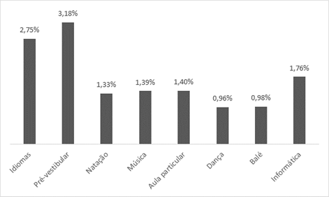 Os dados de gastos com cada tipo de atividade suplementar considerada apresentam uma ressalva importante: ainda que os informantes dos gastos sejam identificados individualmente, nem sempre o gasto realizado está associado à pessoa que de fato frequentou o curso. Esse problema fica claro quando são feitas estimativas de gastos segundo as características dos residentes dos domicílios, como poderá ser visto na próxima seção. De toda forma, no caso das características que são comuns a todos os residentes do domicílio, como renda familiar e anos de estudo da pessoa de referência[3], esse problema não ocorre.