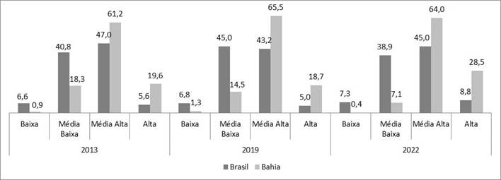 Ao avaliar as oscilações nos resultados em cada nível de esforço docente entre 2013 e 2022 no Brasil se observou incremento dos percentuais de docentes cujo trabalho foi classificado nos níveis 1 a 3 (menor esforço) e diminuição dos percentuais dos níveis 4 a 6 (maior esforço). Na Bahia, este movimento foi inverso, com incrementos dos percentuais dos docentes cujo trabalho foi classificado nos níveis de maior esforço.