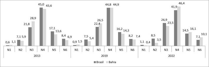 Em outra variável de gestão do trabalho docente, o esforço é avaliado pelo Inep em seis níveis: do nível 1 (N1) que indica menor esforço/sobrecarga ao nível 6 (N6) que indica maior sobrecarga. Os maiores percentuais de esforço docente na rede estadual (BR e BA) ao longo do período avaliado foram observados no nível N4, que descreve o trabalho docente junto a grupos de 50 a 400 estudantes, atuando em dois turnos, em um ou duas escolas e em duas etapas (Figura 2).
