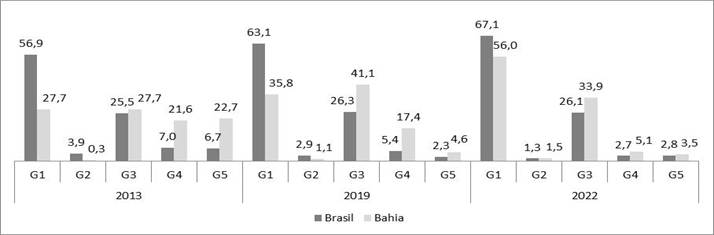 Por último, o indicador de Adequação da Formação Docente permite classificar os/as docentes em exercício na Educação Básica considerando sua formação acadêmica e a(s) disciplina(s) que leciona. A classificação se dá em cinco níveis de adequação - do grupo 1 (G1) que descreve maior adequação, ao grupo 5 (G5) que descreve menor adequação (Figura 3). Ao longo do período analisado, observou-se melhoria do índice de adequação da formação docente tanto na Bahia quanto no Brasil, com incrementos no percentual do Grupo 1 que descreve maior adequação e diminuição gradual dos percentuais do Grupo 5 que descreve menor adequação (cf. Figura 3). Na Bahia, esta melhoria foi bastante evidente (e.g. G1 27,7% em 2013; 56,0% em 2022), embora os índices de melhor adequação ainda estivessem abaixo do observado em âmbito nacional em 2022.