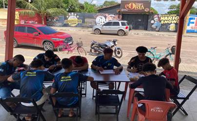Em seguida, solicitei aos alunos e alunas que realizassem dois desenhos, no primeiro desenho, pedi que eles relatassem onde surgiu o primeiro contato com a luta marajoara na vida deles, se foi alguém da família que ensinou, se foi na escola, se foi com algum amigo ou amiga; já no segundo desenho, pedi que eles contassem por meio da sua criatividade desenhada, qual foi o primeiro movimento/técnica/golpe que eles aprenderam e onde foi.