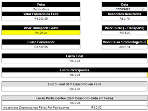 Você entra na planilha e já vê lá. Ah, estou vendendo mais hoje, tal lugar. Ah, eu estou vendendo esse mês... E a gente também, cada feira, na hora que você analisa que está vendendo menos, a gente tem que ver o que está errado para a gente aumentar a venda também. Colocar mais produto, colocar produto diferenciado, entendeu? A gente vê e aumenta a venda. Pela análise que você vê que uma está menos e a outra está mais, aí a gente ataca naquela ali para melhorar. (Encontro 3, Pesquisador).