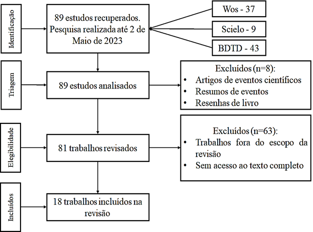 Na primeira triagem (Filtro 2) 8 trabalhos foram excluídos considerando como critérios de exclusão artigos apresentados em eventos científicos, resumos de eventos e resenhas de livros. Como elegibilidade (Filtro 3) desta RSL foram revisados 81 estudos encontrados, sendo que destes foram excluídos 63 obedecendo os seguintes critérios, trabalhos foram do escopo desta revisão e estudos sem acesso ao texto completo. Resultaram (Filtro 4) como amostra 18 trabalhos para análises e discussões que atenderam ao foco desta pesquisa.