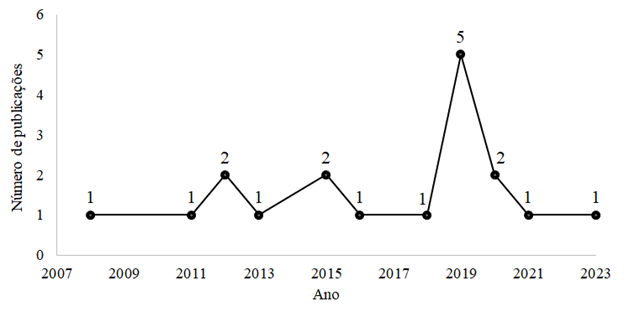 A distribuição temporal dos estudos analisados nesta pesquisa está apresentada no Gráfico 1. Destacamos que no ano de 2019 ocorre o maior número de publicações sobre a temática (n=5). Assim como, existem lacunas nos anos de 2009, 2010, 2014 e 2022, onde observação não haver publicações para os respectivos anos.