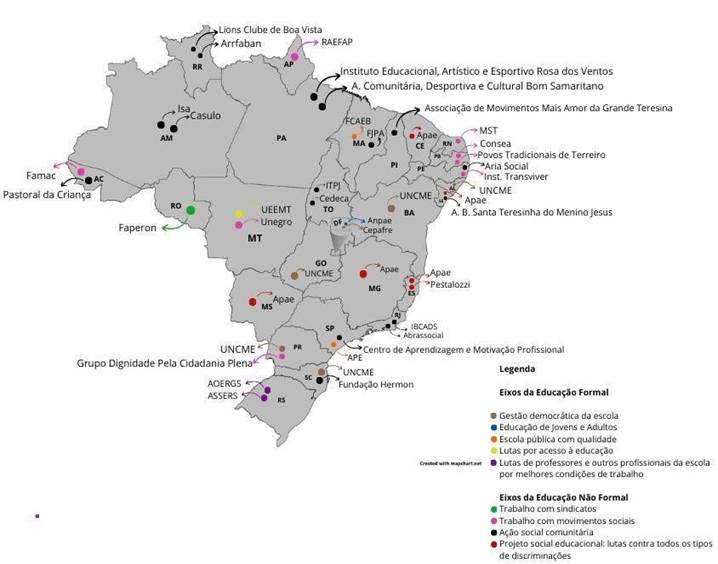 As organizações foram categorizadas a partir dos eixos de demandas identificados por Gohn (2011), em relação aos movimentos que abarcam reivindicações em torno da educação formal e não formal. No que tange à educação formal, a autora estabeleceu 17 eixos, desses, apenas cinco se relacionavam com as lutas e reivindicações das organizações localizadas, sendo: 1) lutas por acesso à educação (seja da educação básica ou superior); 2) demandas por escolas públicas de qualidade; 3) lutas pela gestão democrática nas escolas; 4) reivindicações de docentes por melhora de salários e condições de trabalho; 5) lutas para a educação de jovens e adultos.