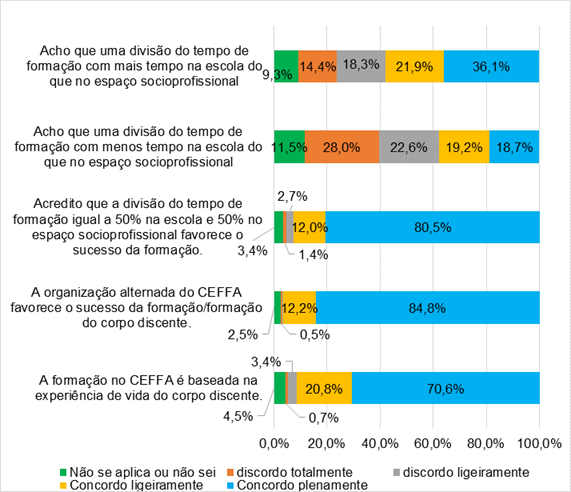 Nesse primeiro gráfico as percepções foram destinadas, especialmente aos tempos formativos, o que tem sido objeto de discussão junto às famílias, docentes e estudantes, de modo que a indagação precípua se refere a qual deve ser o tempo necessário para a verdadeira alternância, numa perspectiva integrativa e conciliadora das possibilidades de estudo e trabalho. Nesse sentido, como é possível observar, 80,5% das famílias compreendem que o tempo na proporcionalidade de 50% no CEFFA e 50% no meio socioprofissional/comunitário/familiar favorece o sucesso da formação. O que é fortalecido ainda com a percepção de 84,8% das famílias sobre a organização alternada do CEFFA contribuir para a formação. Esta, portanto, tem sido a organização atual dos tempos formativos da expressa maioria dos CEFFAs no Brasil, o que também nos revela a não sobreposição de tempos e espaços formativos, destinando à escola e ao meio socioprofissional-comunitário/familiar a mesma temporalidade. Avaliar os tempos formativos a partir dessa escuta, nos remete ainda ao registro da relevância da alternância temporal, compreendendo que ela não é apenas uma sucessão cronológica e alternada de tempo e espaço (Rocha et. al., 2010), mas é uma pedagogia formativa que integra saberes, fazeres e sujeitos no processo formativo dos jovens. A Alternância, no seu ir e vir, forma um movimento entre dois espaços e tempos, que não podem ser compreendidos como duais e dicotômicos, mas integrados e amalgamados, o que se efetiva com as mediações didático-pedagógicas (Gerke de Jesus, 2011; Begnami, 2019).