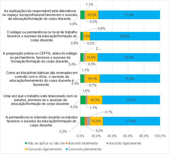 A partir do exposto no gráfico 02, categorizamos as percepções acerca dos aspectos didático-pedagógicos circunscritos ao estágio supervisionado; à relação dos conteúdos das disciplinas básicas com as experiências do trabalho (ofício); e à permanência do jovem no internato durante a sessão no CEFFA. Todas com um índice de mais de 70% de concordância das famílias como favoráveis à formação. Tais questões também figuram na pauta dos debates sobre a qualificação do trabalho com a Pedagogia da Alternância, em especial a relação necessária entre os saberes curriculares das disciplinas da educação básica e os saberes vivenciais do mundo do trabalho, como a permanência ou não dos estudantes no internato.